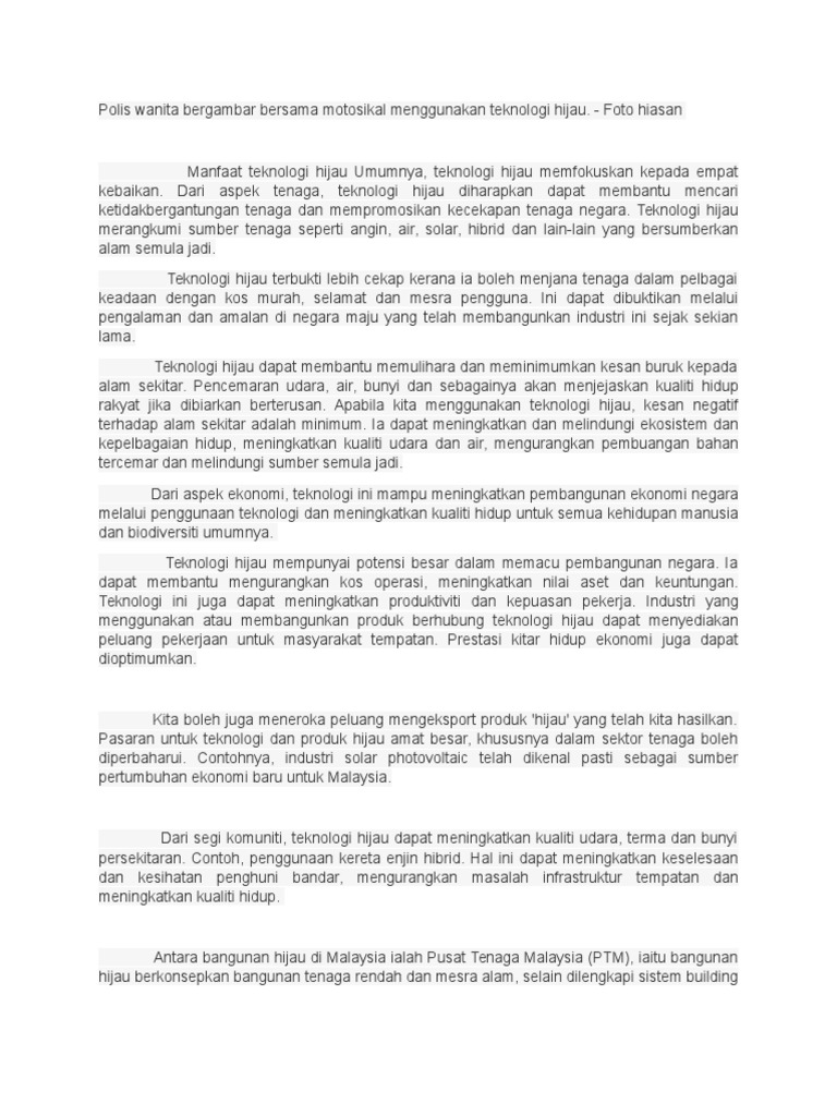 Pdf Impak Pemerkasaan Teknologi Hijau Terhadap Amalan Pengamal Perhubungan Awam Hijau Di Malaysian Green Technology Corporation Impact Of Green Technology Empowerment Towards Green Public Relations Practice At The Malaysian Green Technology Corporation from i1.rgstatic.net Memperkukuhkan pembangunan modal insan dalam teknologi hijau 4. Teknologi hijau juga berperanan sebagai alternatif dalam usaha meningkatkan ekonomi negara tanpa menjejaskan alam. Menyediakan persekitaran pembangunan teknologi hijau yang kondusif Teknologi hijau telah dikenal pasti sebagai salah satu cara dan penyelesaian dalam melestarikan alam sekitar. Penggunaan meluas teknologi hijau mengurangkan penggunaan sumber secara keseluruhan, di samping mengekalkan pertumbuhan ekonomi negara; Kemajuan yang signifikasikan dan peningkatan utama dalam empat (4) sektor utama yang berikut : Kereta hibrid, keretapi elektrik mrt, kereta ngv, petrol tanpa plumbum, aktiviti berbasikal, berkongsi kenderaan dan menaiki pengangkutan awam seperti bas; Penerapan teknologi hijau dalam budaya malaysia;